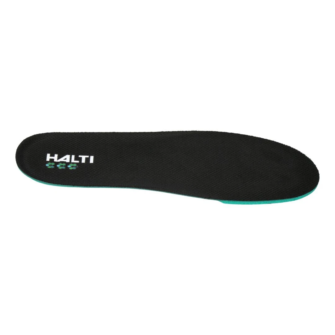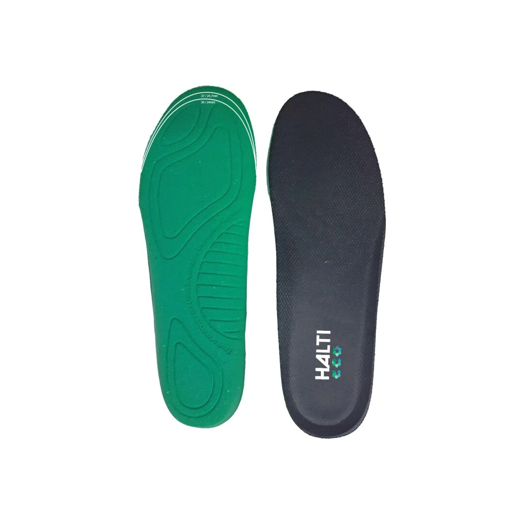 Päivitä Halti kenkäsi erityisen pehmeillä ja mukavilla ECO comfort pohjallisilla. Ne on valmistettu ympäristöystävällisestä kierrätetystä PU’sta, johon ei hajut tartu, ja päällystetty kierrätetystä polyesteristä valmistetulla kankaalla. Pohjalliset voidaan leikata saksilla oikean kokoiseksi.