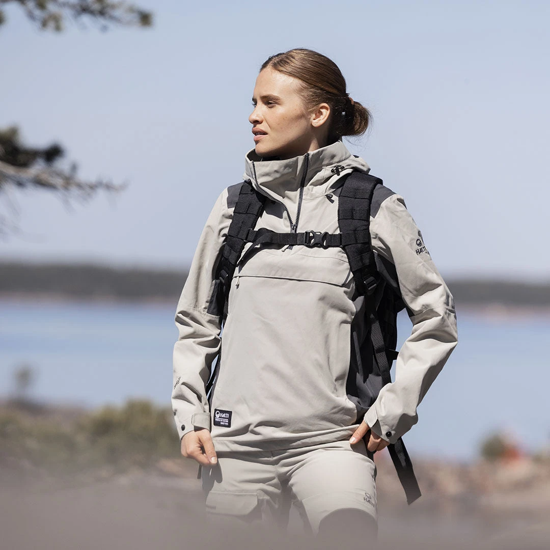 Anorakissa on vahvat, kulutusta kestävät materiaalit ja vedenpitävä, tuulenpitävä sekä hengittävä DrymaxX® Ultimate-kalvo. Joustava stretch-materiaali sivuissa tuo mukavuutta käyttöön, ja iso suojaava huppu sekä edessä oleva läppätasku tuovat takkiin uniikin ulkonäön. Anorakin toiseen helmaan on lisätty pitkä sivuvetoketju helpottamaan takin pukemista ja riisumista.