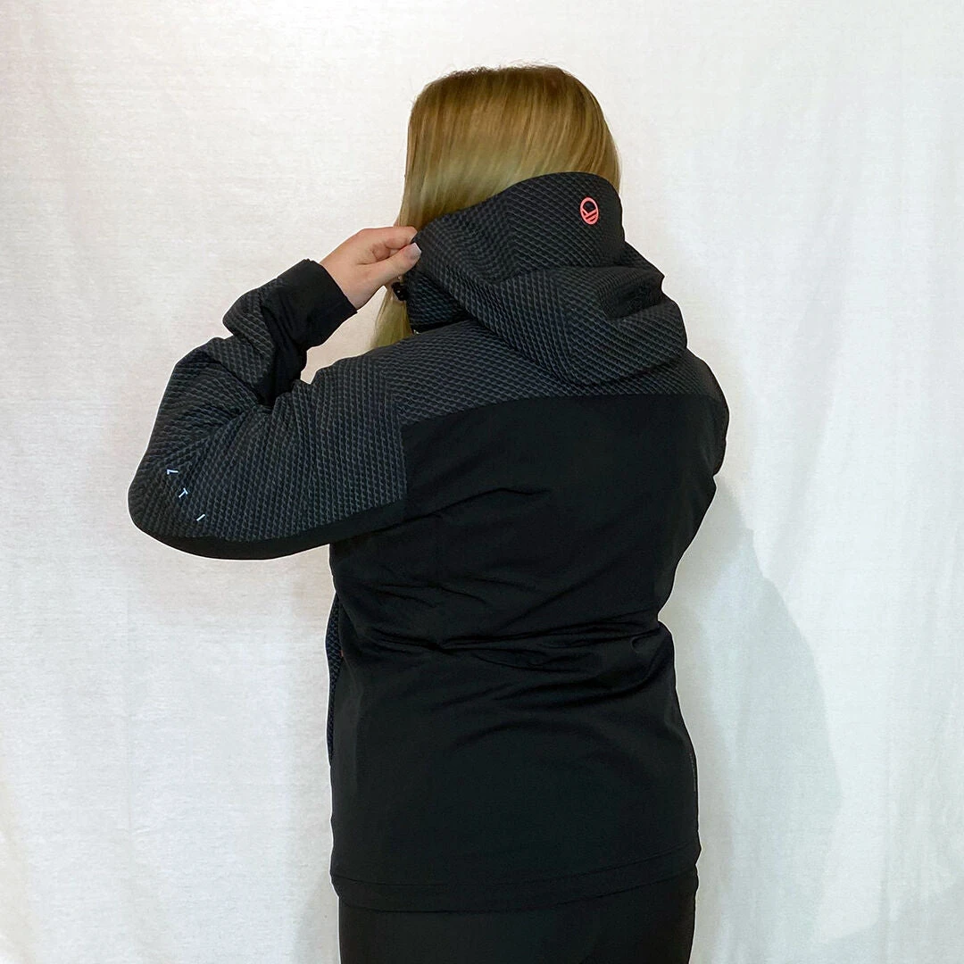 Takissa on pehmeäksi harjattu sisäpinta, mikä tuo lämpöä viileämmillä keleillä. Joustava materiaali myötäilee liikettä ja mahdollistaa laajat liikeradat. Takin valmistuksessa on käytetty kierrätettyjä ja bluesign® sertifioituja materiaaleja.